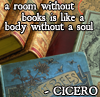 Description: Picture of books with quote from Cicero: "a room without books is like a body without a soul"
